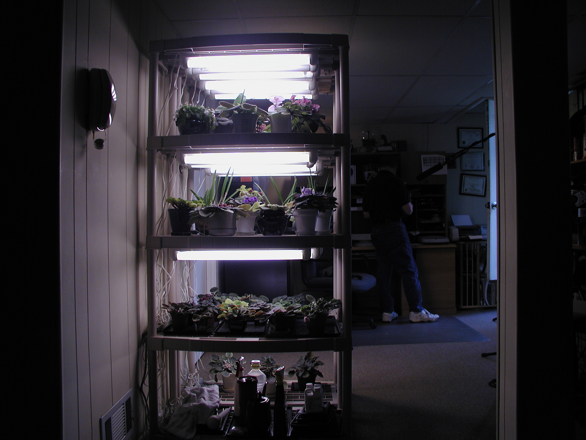 that there are large trays with plants getting UV light in the same room