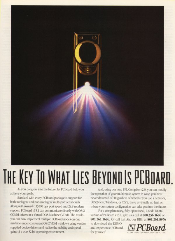 MAGAZINE ADVERTISEMENT: PC-Board: "What Lies Beyond" (Boardwatch, July 1994) (Large Version)