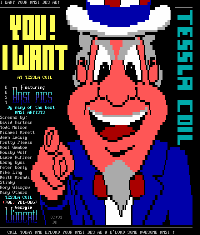 BBS AD: I Want YOU at Tesla Coil BBS (ANSI Artist All-Star List, Including Ebony Eyes) (1991)