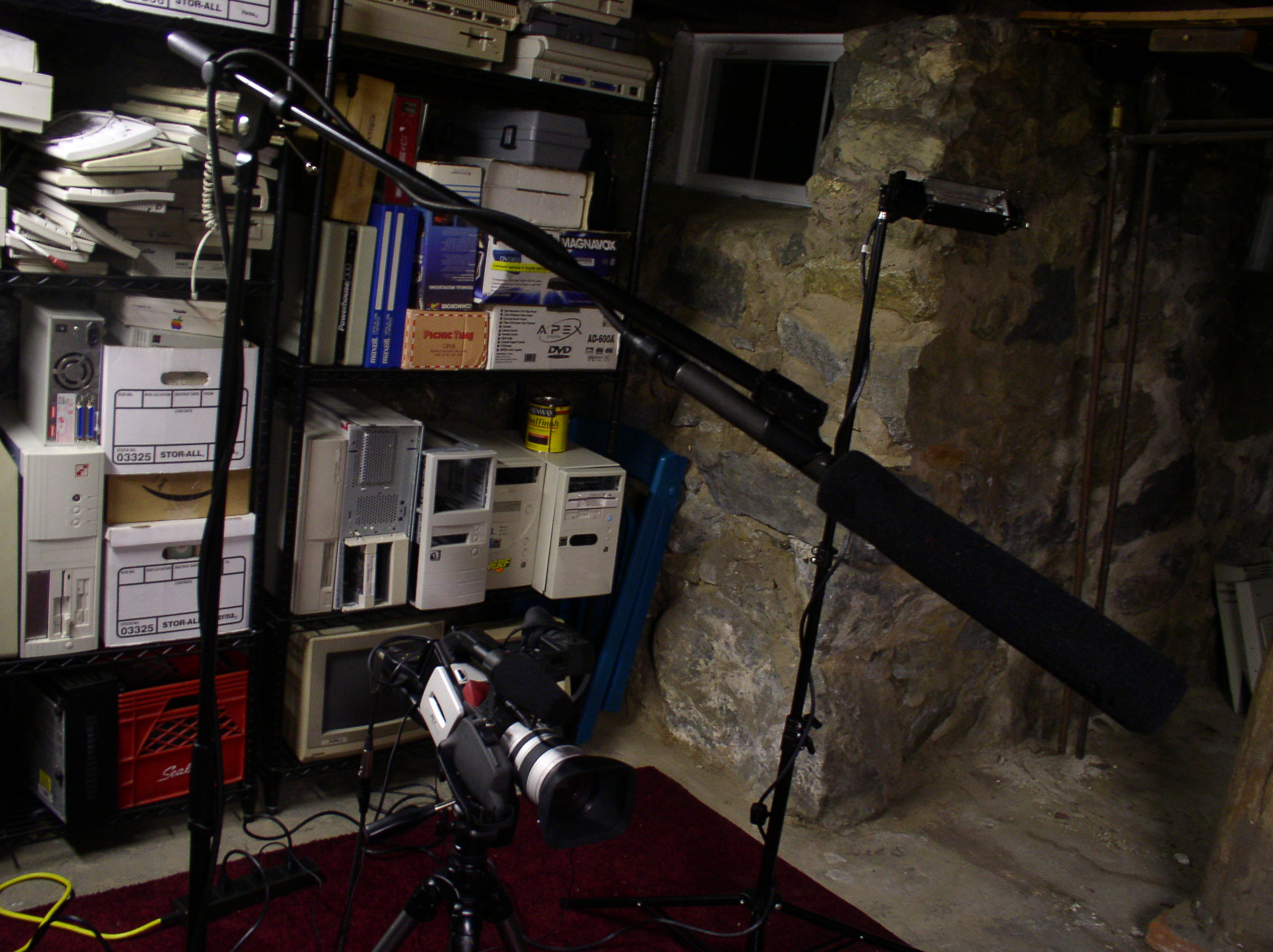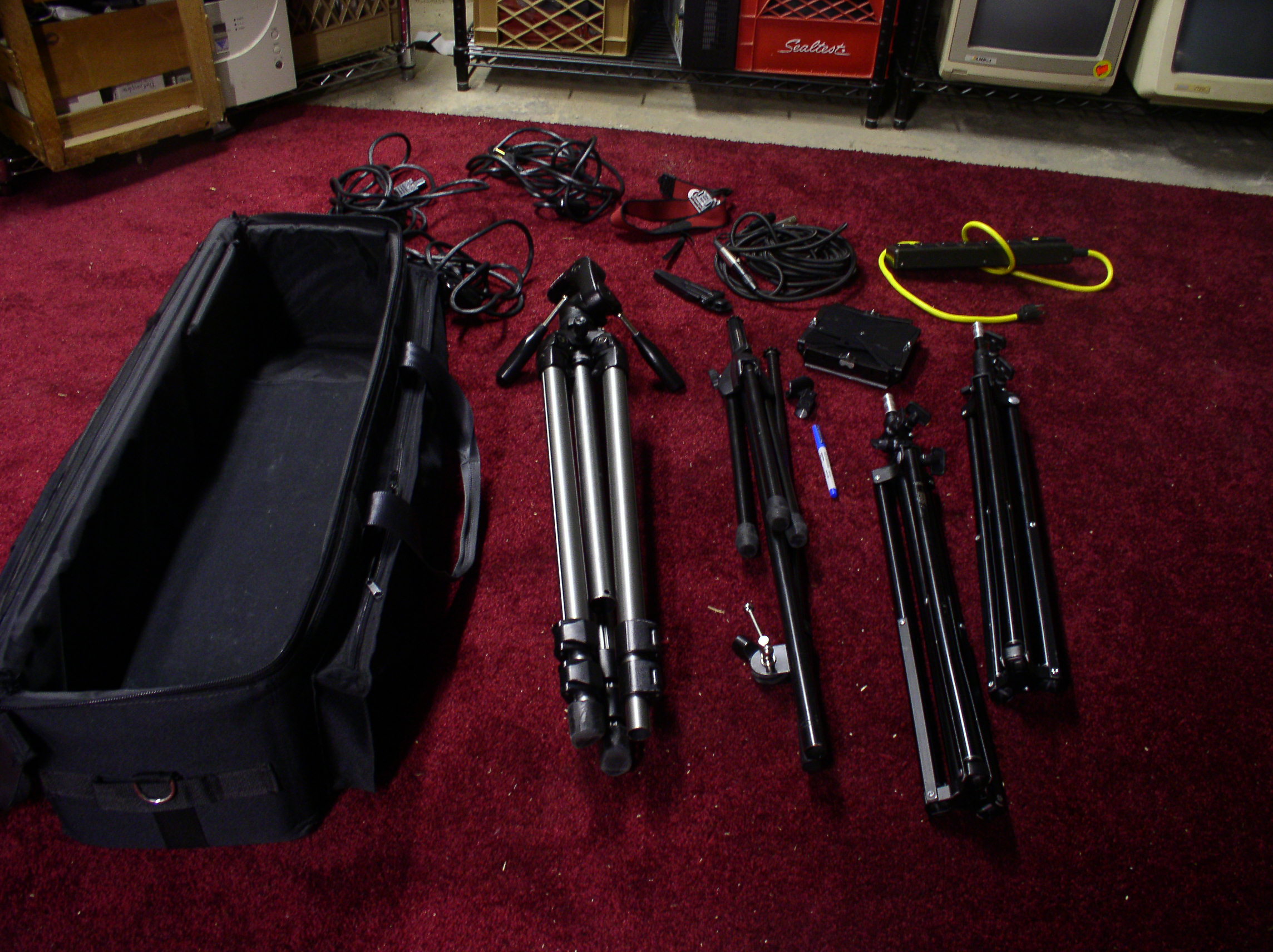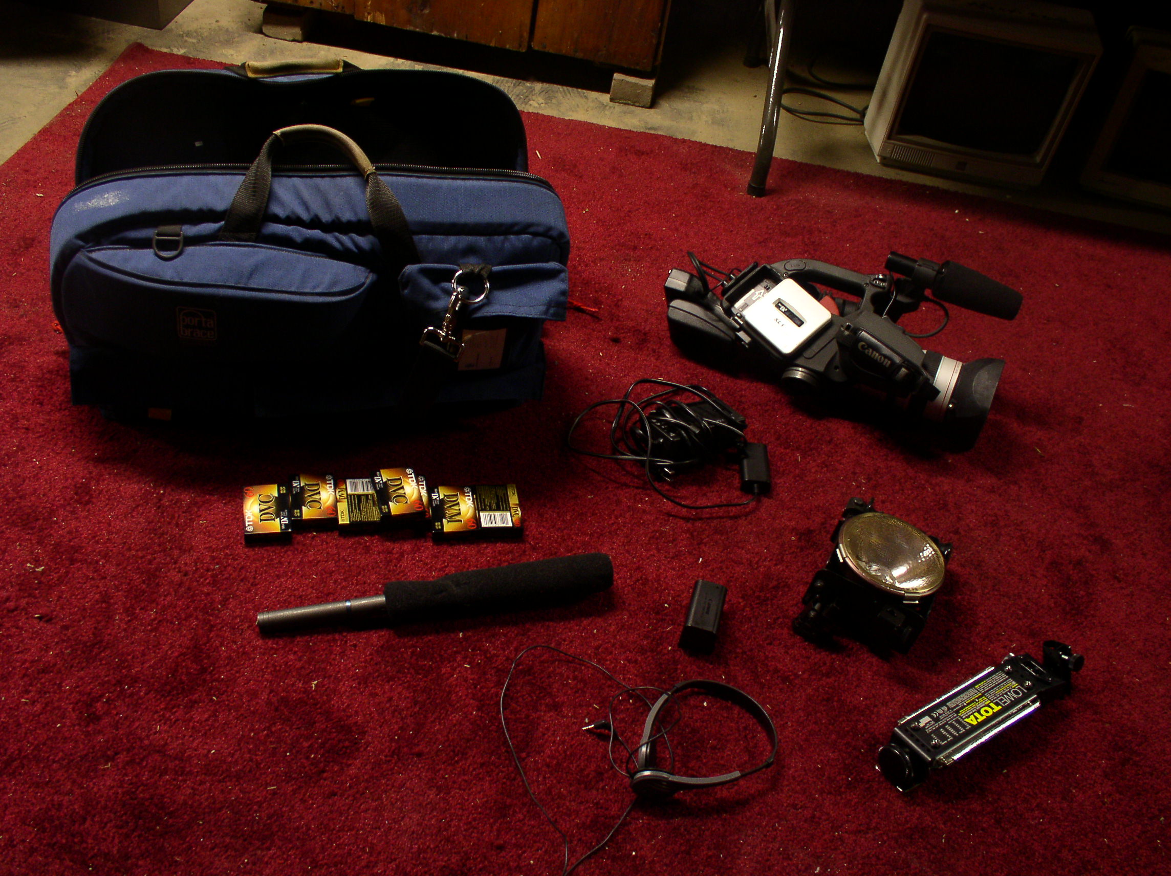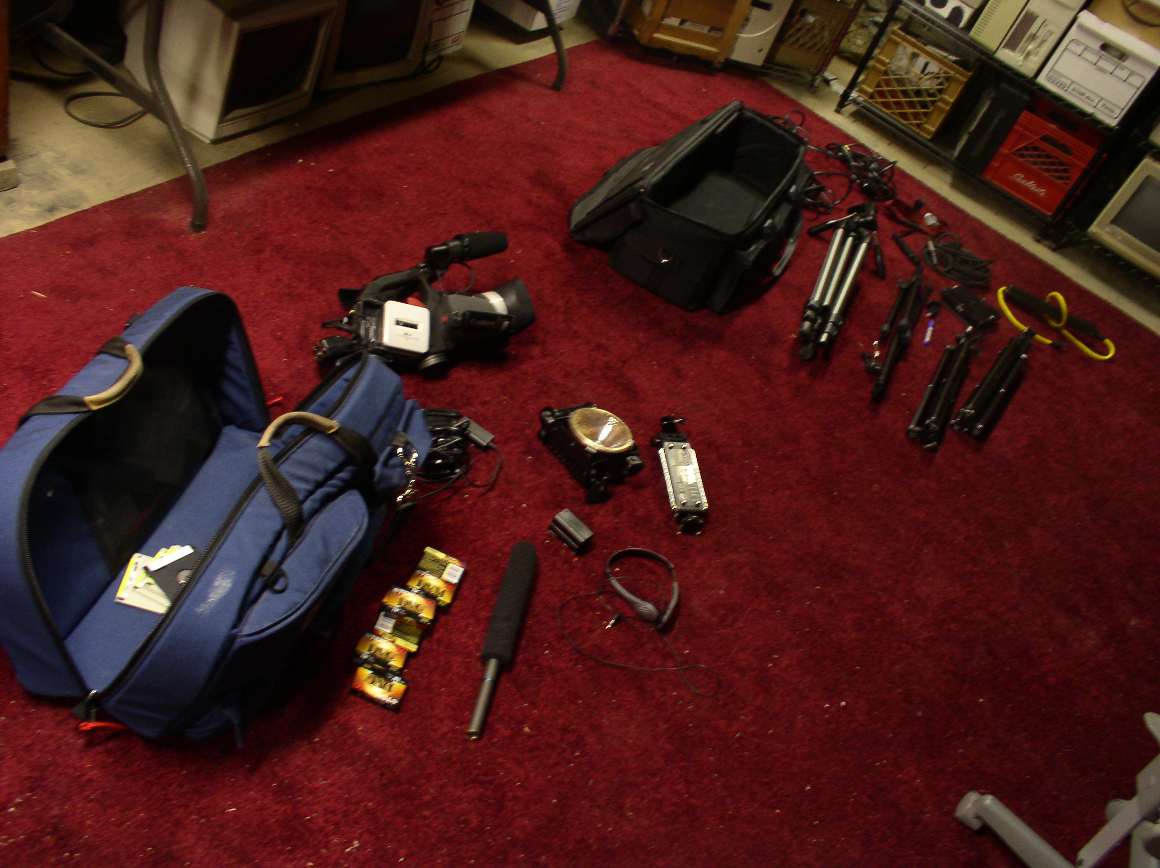 bag: lights, boom mike, cable, camera, tapes, and power supplies/cords.