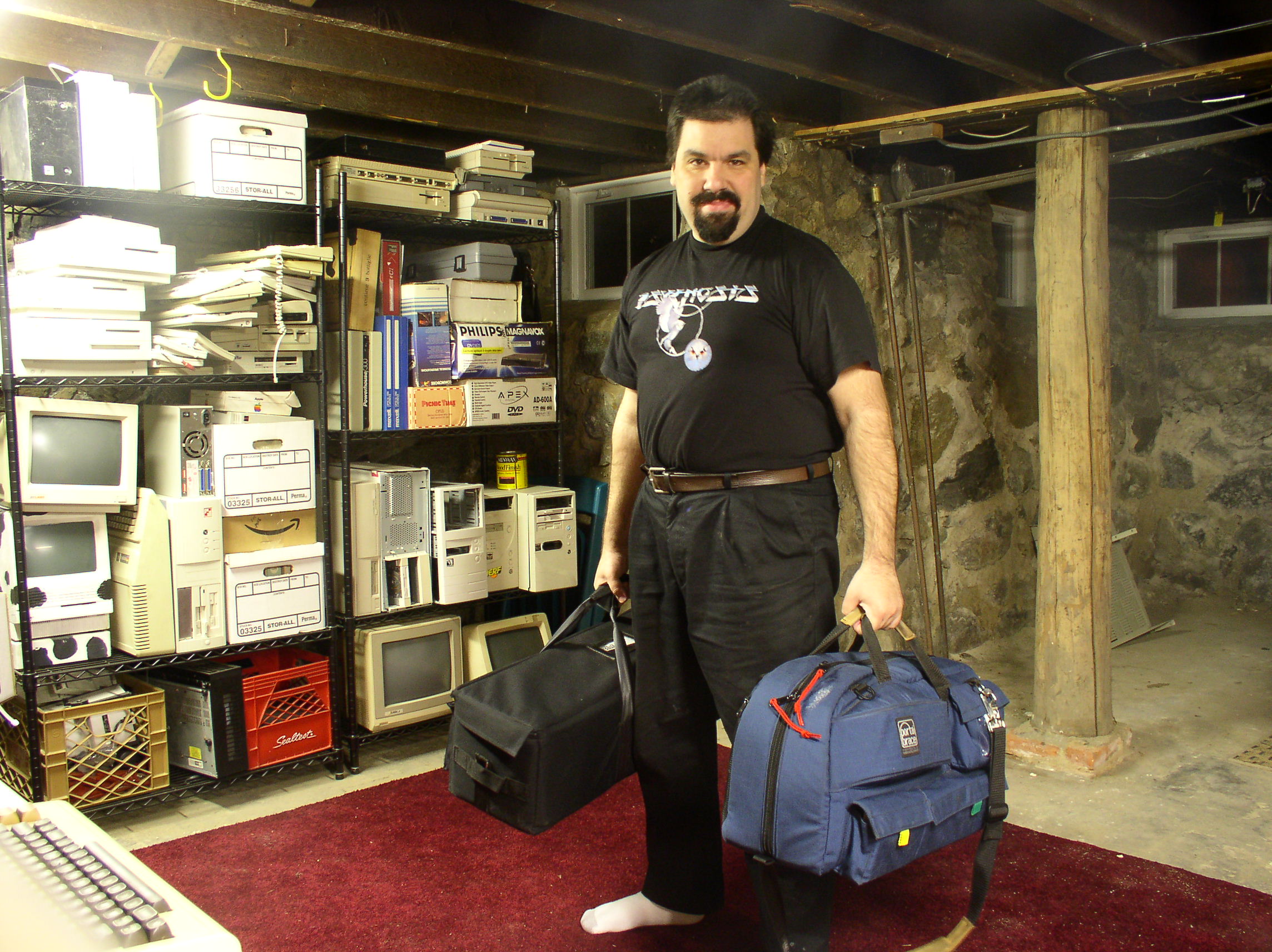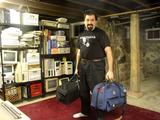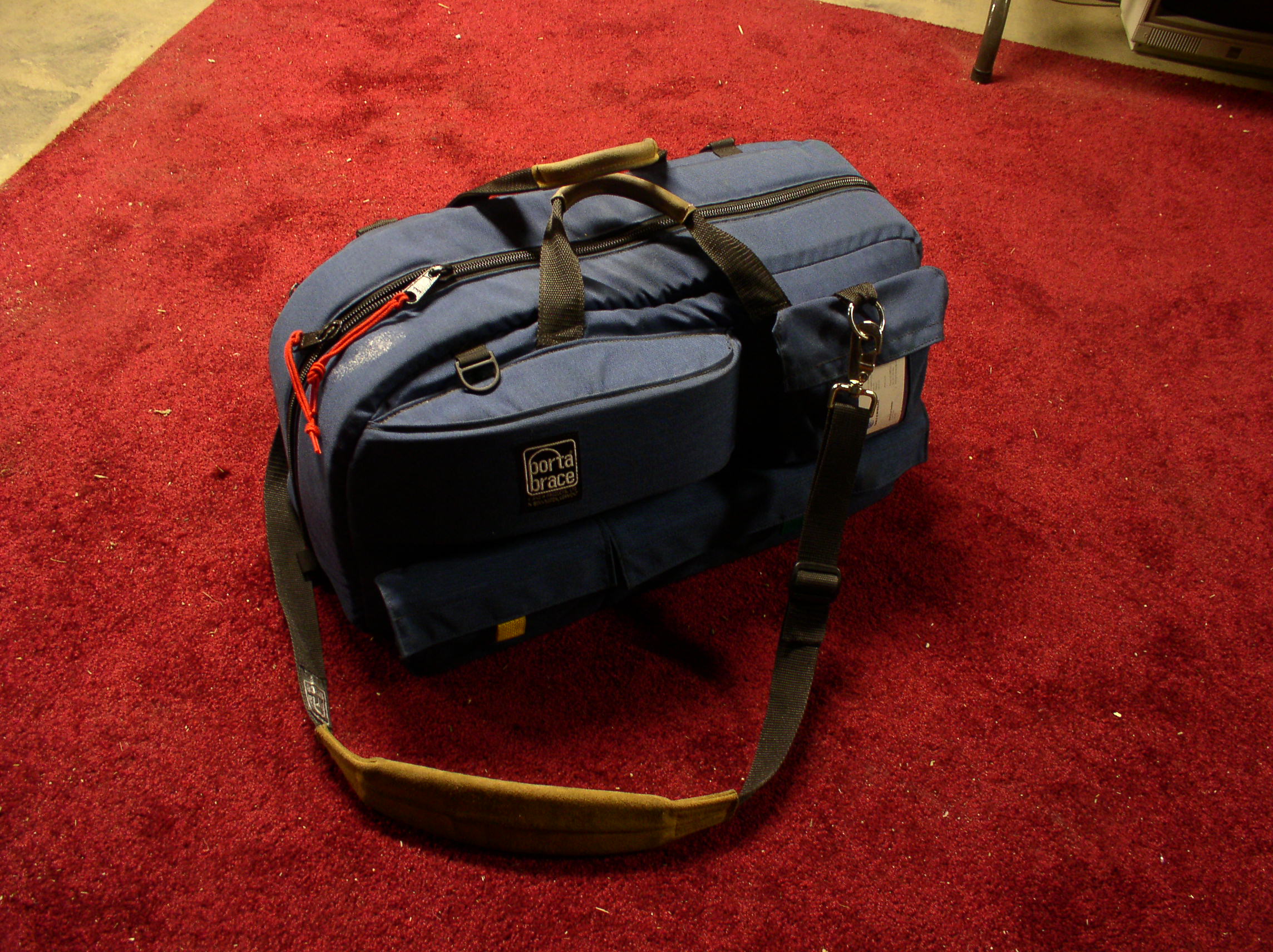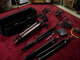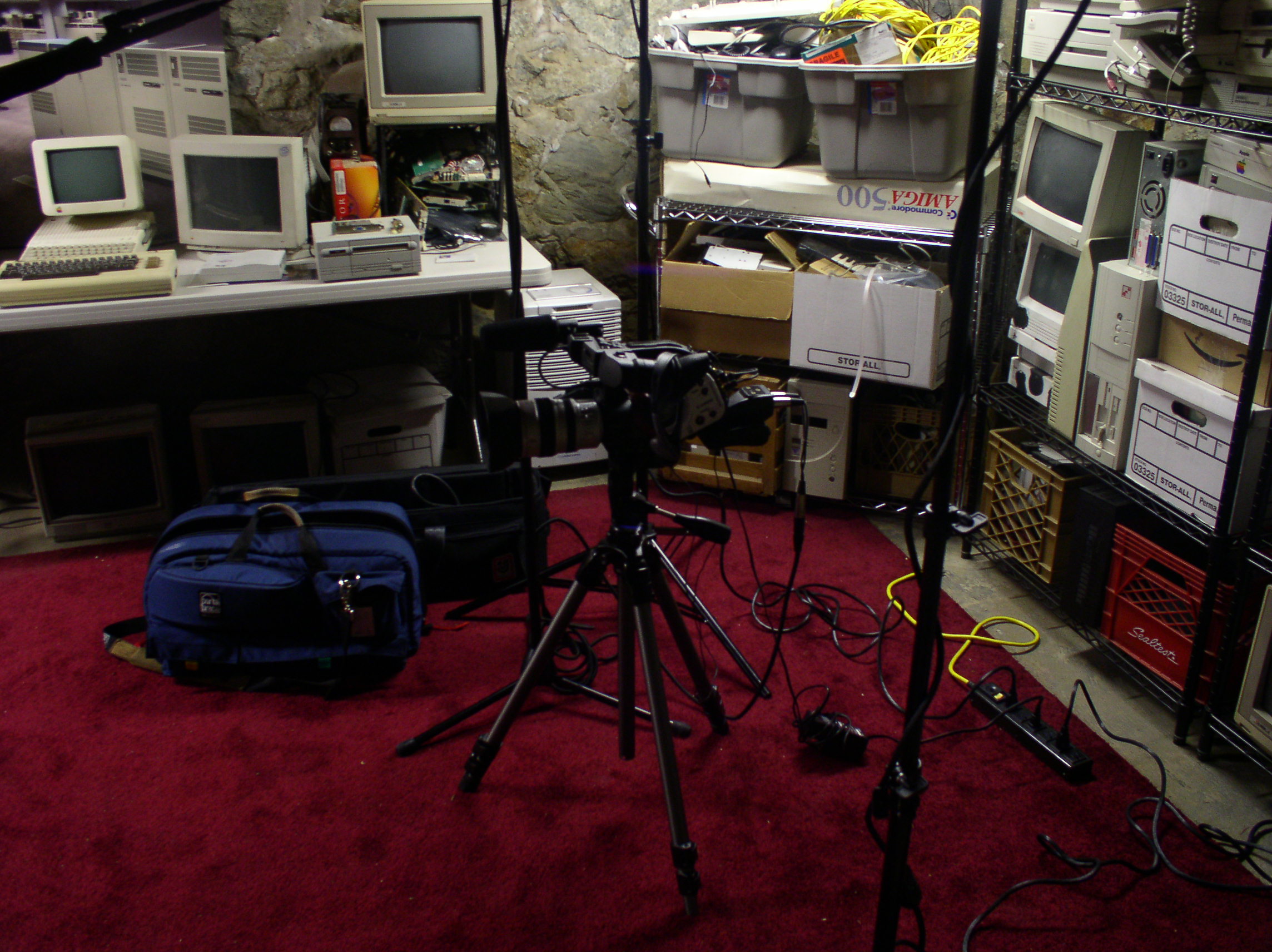 bag: lights, boom mike, cable, camera, tapes, and power supplies/cords.