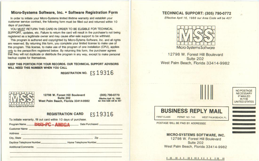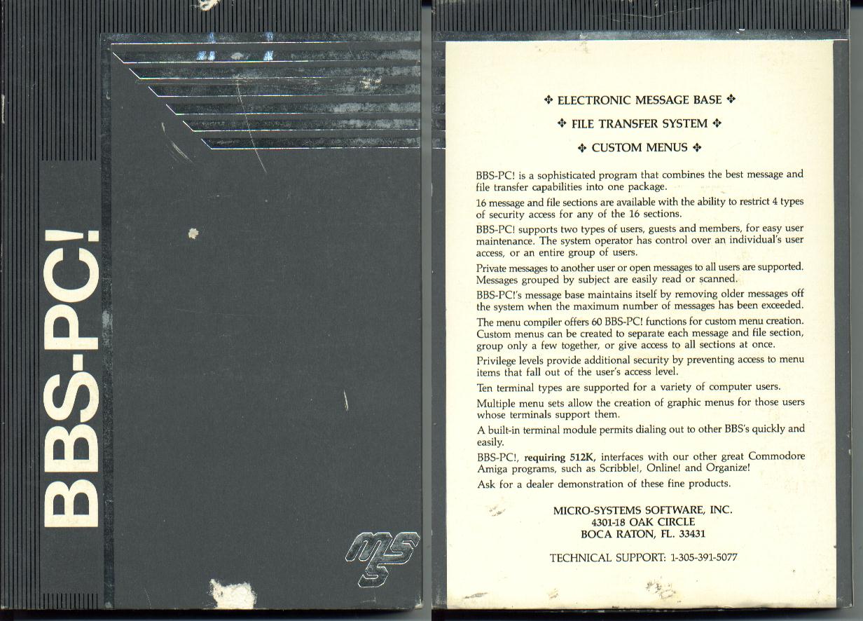 | Lance Lyon writes "You mention "BBSPC" in the Amiga section, it's actually BBS-PC! & two versions came out 4.13 & 4.20 that were identical to the MS DOS versions. BBS-PC! was commercial software & was quite popular in the mid to late '80's. It was produced by Micro Systems Software (who wrote several titles for the Amiga) & even had third part rudimentary networking (BBS-PC! systems only) & a few doors for it."