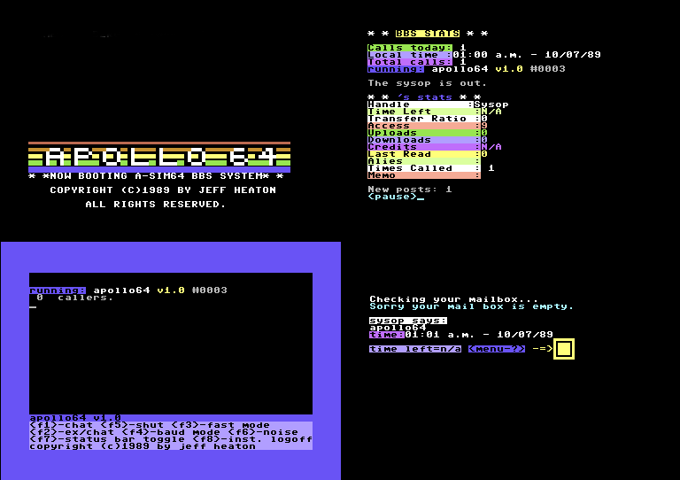 | Apollo 64 is a Commodore 64 BBS system that provided message boards, download areas, online games, and text files. It required very little RAM to run and could run on an unmodified Commodore 64 that did not have a RAM Expansion Unit (REU). The complete basic code, 6510 assembly code, and D64 images have been released as LGPL.